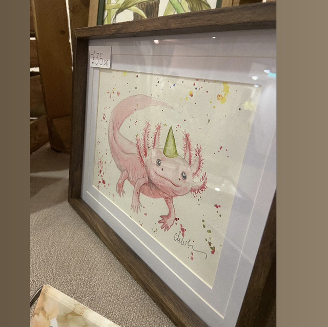 Original ‘Birthday Axolotl’ A5 painting in dark wood frame