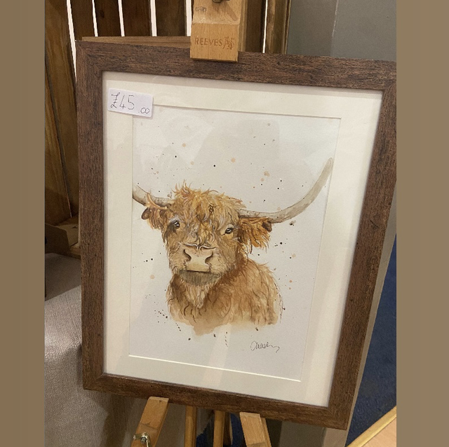 Original A4 painting of ‘Hamish’ highland cow , in dark wood effect frame.