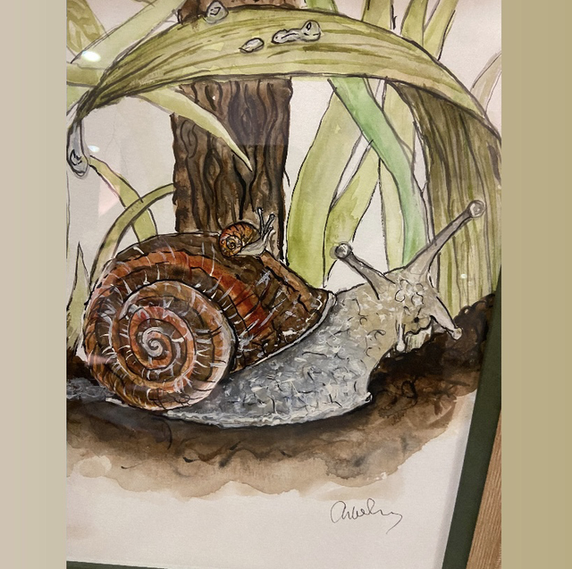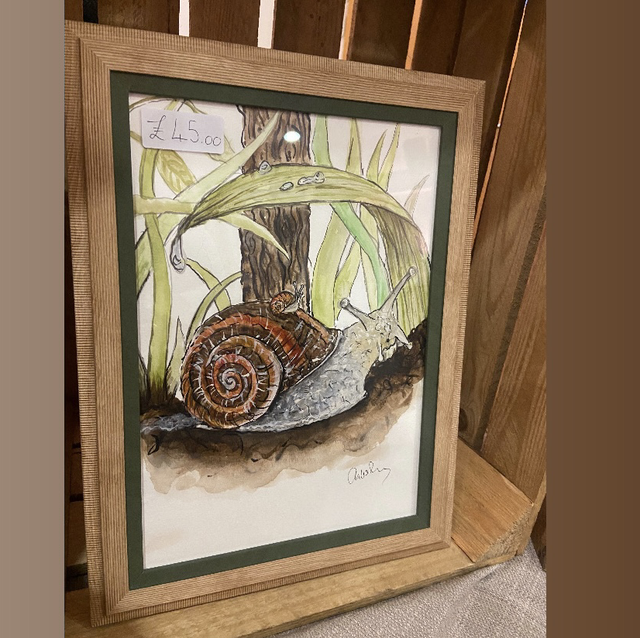 Original A4 painting of ‘Seymour’ the snail in light wood and khaki effect frame.